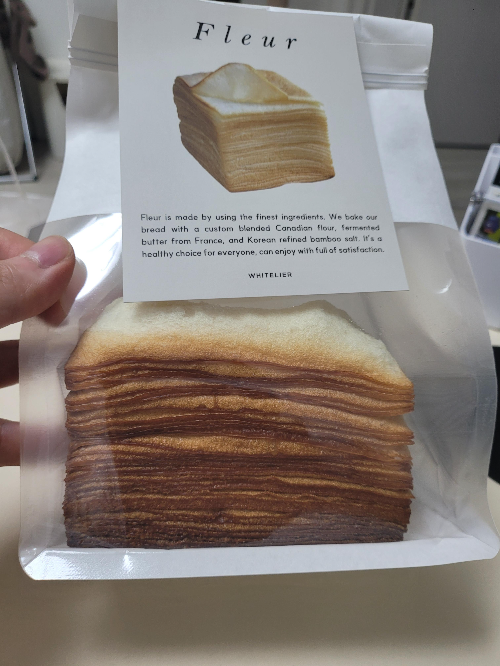 신메뉴은 플뢰르는 빵을 곁곁이 쌓아논 느낌이였는데 가격대는 부담스러웠지만 너무 맛있었습니다. 빵이 무슨 얇게 져민 햄처럼 뜯어지고 한겹씩 뜯어 먹는 재미가 있었습니다. 식감도 너무 쫀득하고 신기한게 아예 이런 미식경험은 처음인 것 같았습니다. 진짜 한번쯤은 꼭 경험해보라고 추천드리고 싶은 맛입니다.